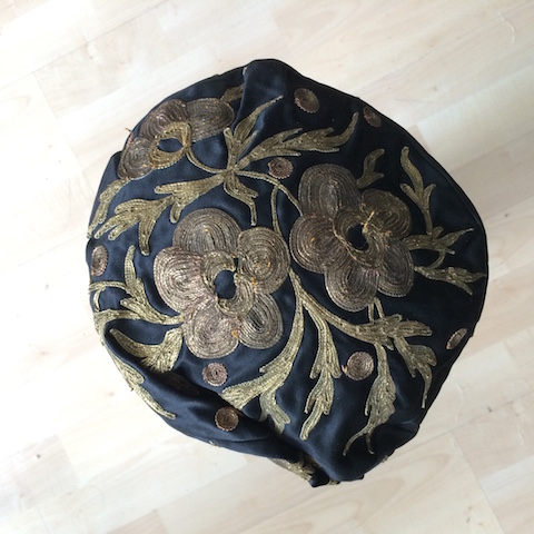 Black silk banded beret with gold soutache embroidery of flowers and leaves