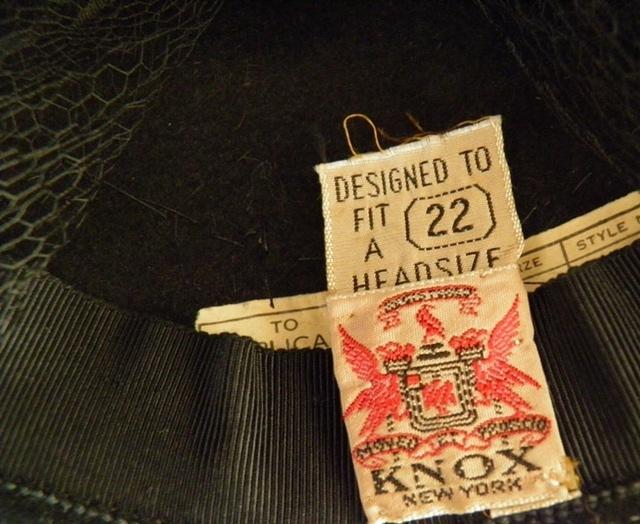 Black felt topper tilt. Crown encircled with black grosgrain ribbon which ends in a front bow. Chest length black patterned veiling . Thin black elastic tilt band.