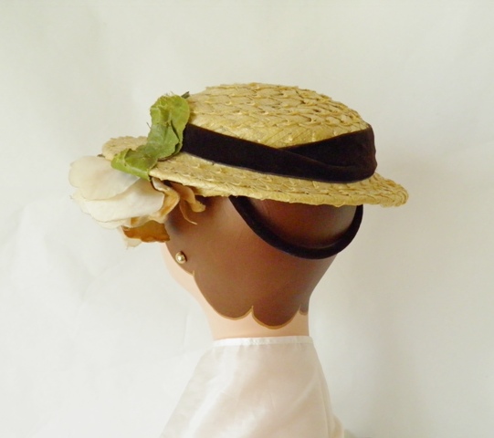 Straw braid tilt. Brown velvet ribbon encircles the crown and the underbrim. A rose peeks out from under the hat. Hat is held forward by a stiff brown velvet tilt ring