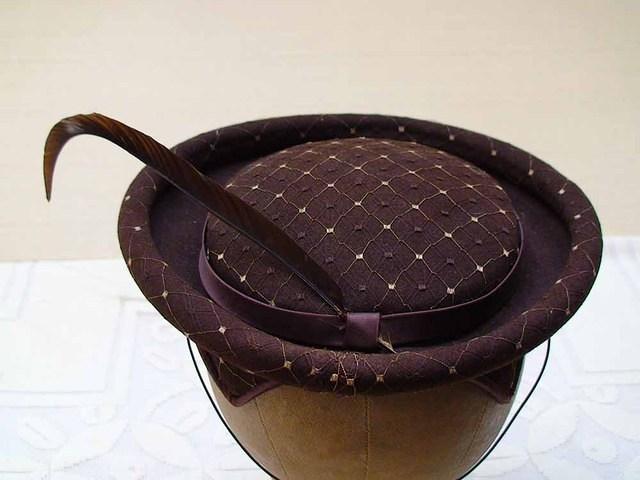 Dark chocolate bumper brimmed sailor with satin ribbon band. Felt crown and brim are covered with diamond-patterned netting. A glycerined feather projects forward from the bow in back.