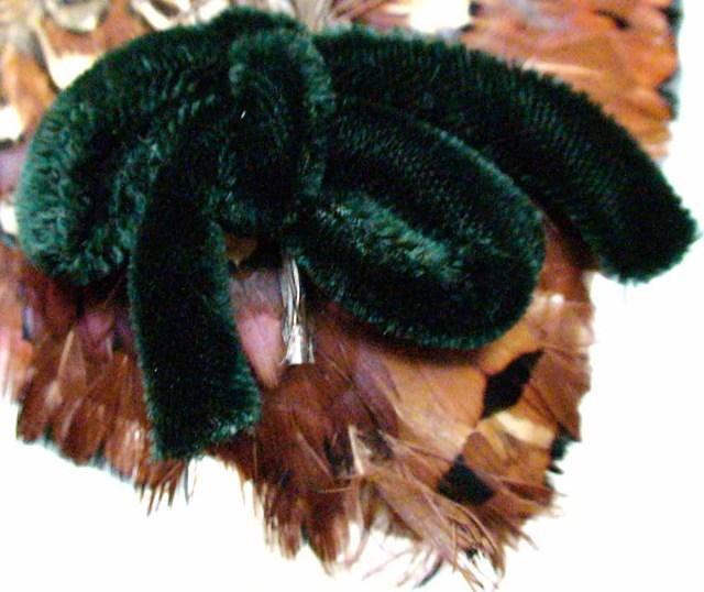 Pheasant feather half hat with off-center medallion pattern. A pheasant tail feather and green velvet tubing bow