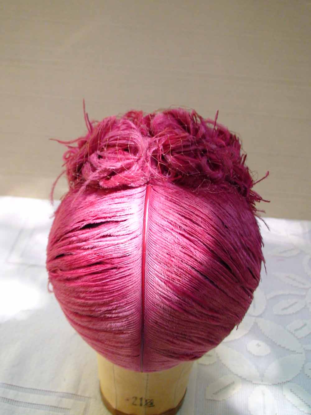 Rose ostrich feather Juliet cap with curled ostrich feathers on front and ostrich feather covering crown