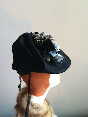 WW2 black felt shaped pancake tilt with thin snood veil and blue feather flowers.
