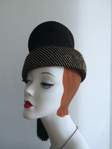 Brown felt Phrygian toque. Black and gold cuff brim. Brown and gold disk ornament with two brown tassels.