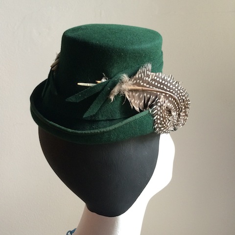 Deep green felt chimney crown with Breton brim doll hat, with guinea fowl feather trim.