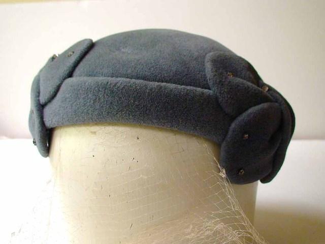 Teal velour 30s-40s shallow brimless cap, with velour band and petals on sides dotted with rhinestones, beige veil ties under chin