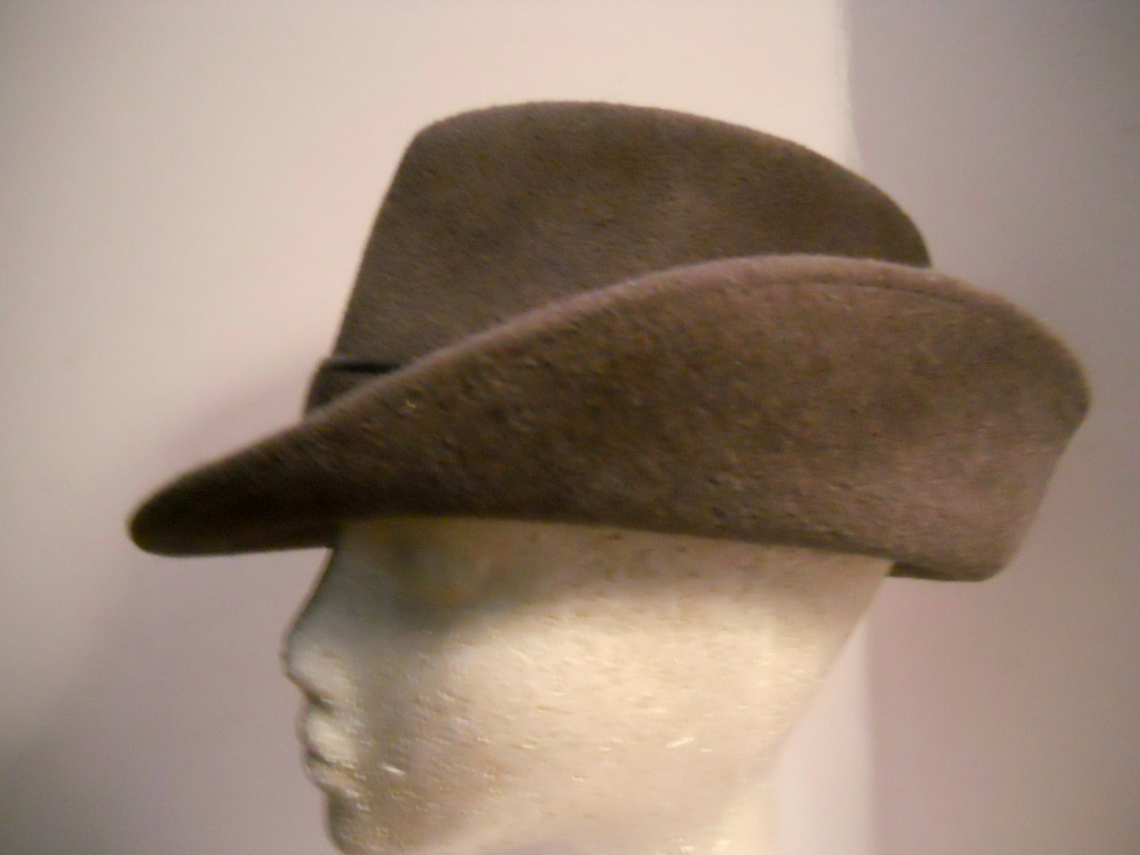 Taupe velour Tyrolean style fedora with asymmetrical upturned brim.