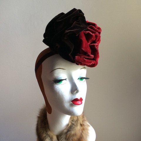 Late 1930s velvet tilt in rich crimson and deep chocolate brown.