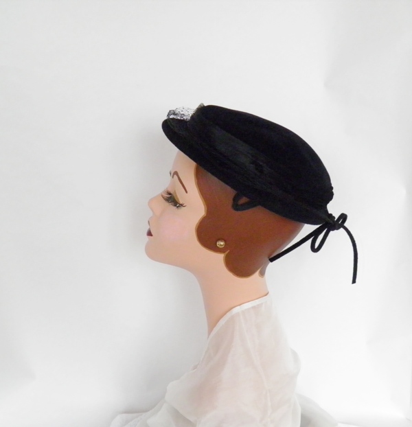 Black velour narrow brimmed roller with fan shaped rhinestone pin accent