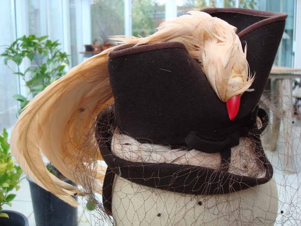 Late 1930s "Spout" style tilt hat with bird (real feathers over foam base). Open crown is caved-in in center, where bird rests, with long curving feathers trailing out back. Netting in front, hard fabric band in back to hold hat on head.