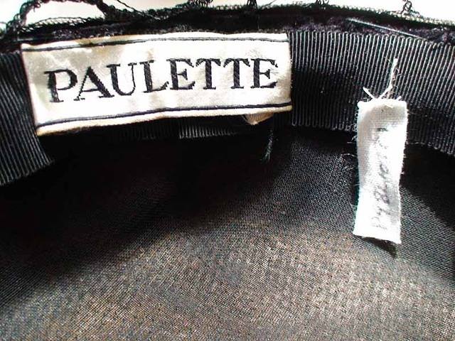 Dark eggplant velvet shallow pillbox with front bow and crocheted stiff veil. Handwritten tag sewn inside has a serial number, possibly indicating it is custom made