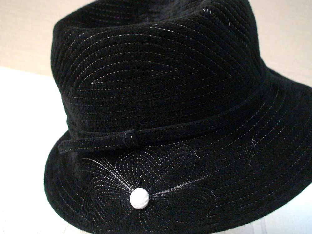 Black trapunto stitched felt bucket with button and bow on band