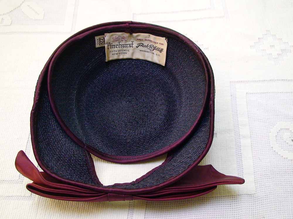 Navy straw flat hat with burgundy bow. Navy straw flat hat with burgundy satin piping, open space and bow