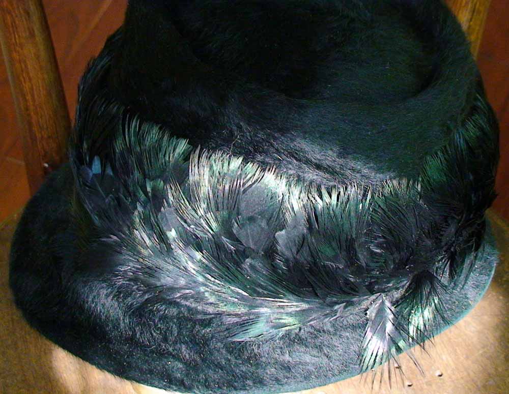 Black beaver fur & feather flowerpot-cloche, with wide blue-green-black hackle feather band, wired brim, hand-sewing