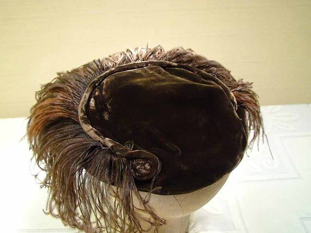 Chocolate velvet mushroom cloche with chocolate ostrich feathers around 3/4 of brim