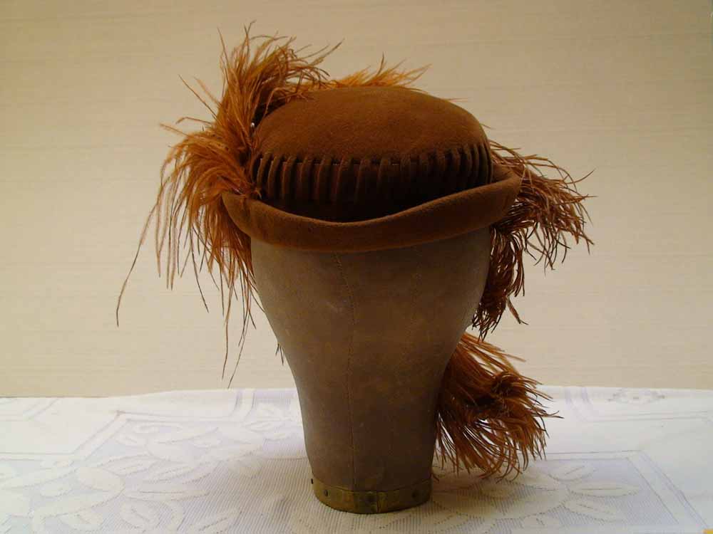 Rust velour felt Empress Eugenie with large ostrich plumes. Grosgrain ribbon is fed through slits in the felt.