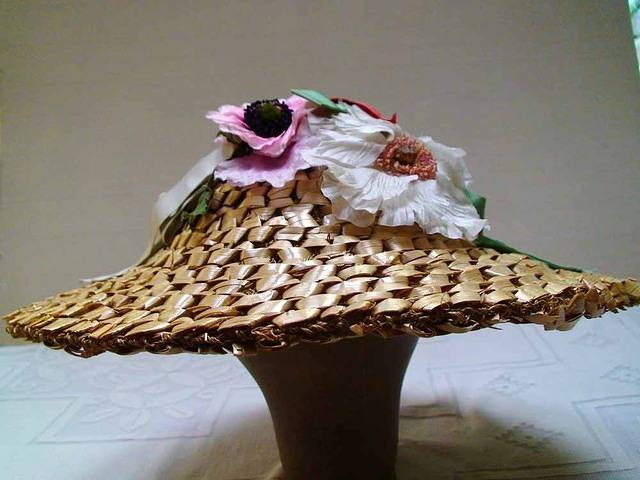 Straw picture hat with mesh crown covered with silk flowers & ribbons