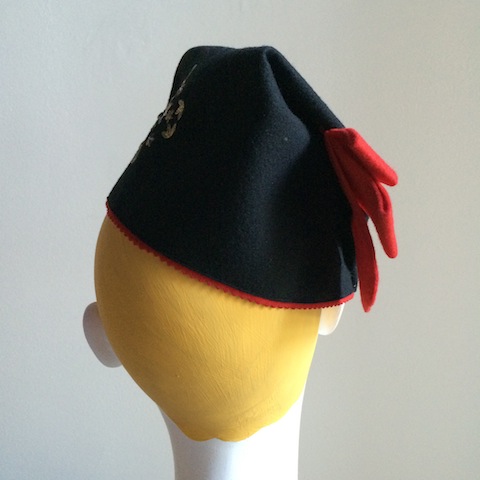 Black felt Phrygian toque with red ribbons and brass ornaments.