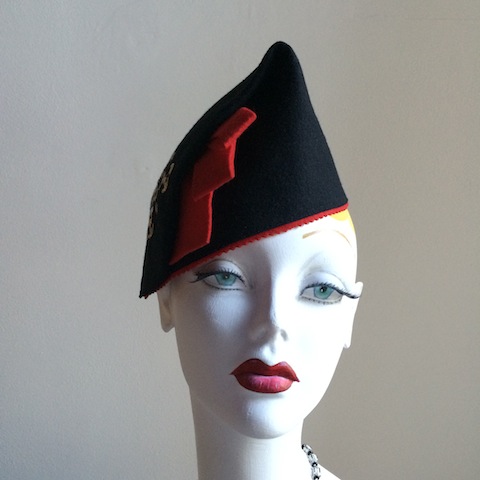 Black felt Phrygian toque with red ribbons and brass ornaments.