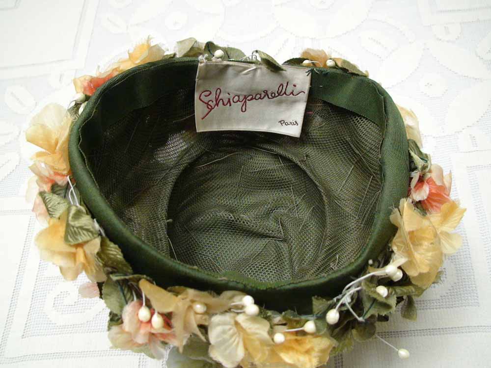 Rounded crown lampshade hat with cording and silk flowers. The crown is covered with rough cording, wrapped in coils, sometimes twisted. A wide band of silk flowers and faux pearls.