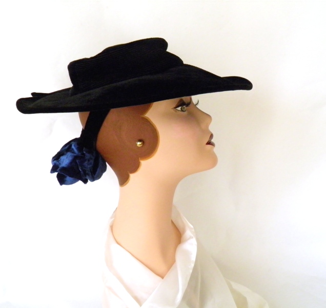 Black velvet wide brimmed tilt with V opening in back. Black velvet back band with blue velvet flower. Underbrim is lined in blue velvet