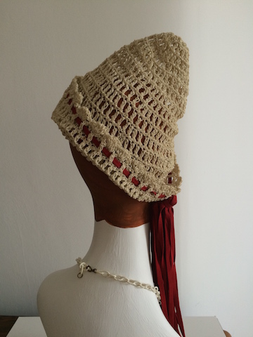 Crocheted Phrygian cap, in stiffened cream yarn, with red ribbon threaded through turned up brim, and tassel.