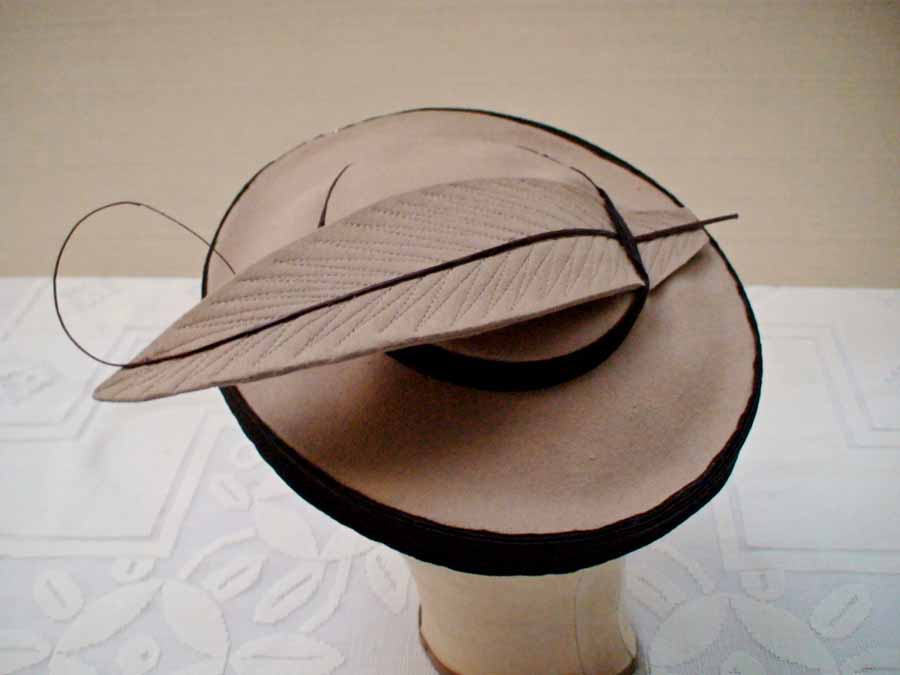 Tan felt tambourine tilt with abstract leaf, the veins created by machine stitching, and, for the leaf stem, a whip made of some type of painted plant material. The shallow crown and brim are edged in brown straw braid.