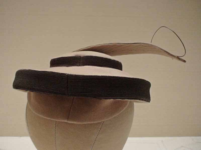 Tan felt tambourine tilt with abstract leaf, the veins created by machine stitching, and, for the leaf stem, a whip made of some type of painted plant material. The shallow crown and brim are edged in brown straw braid.