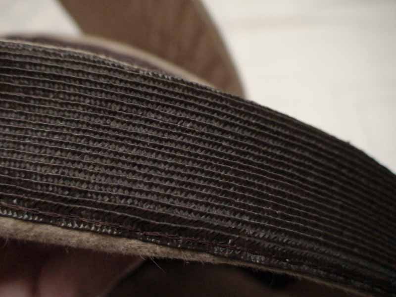 Tan felt tambourine tilt with abstract leaf, the veins created by machine stitching, and, for the leaf stem, a whip made of some type of painted plant material. The shallow crown and brim are edged in brown straw braid.