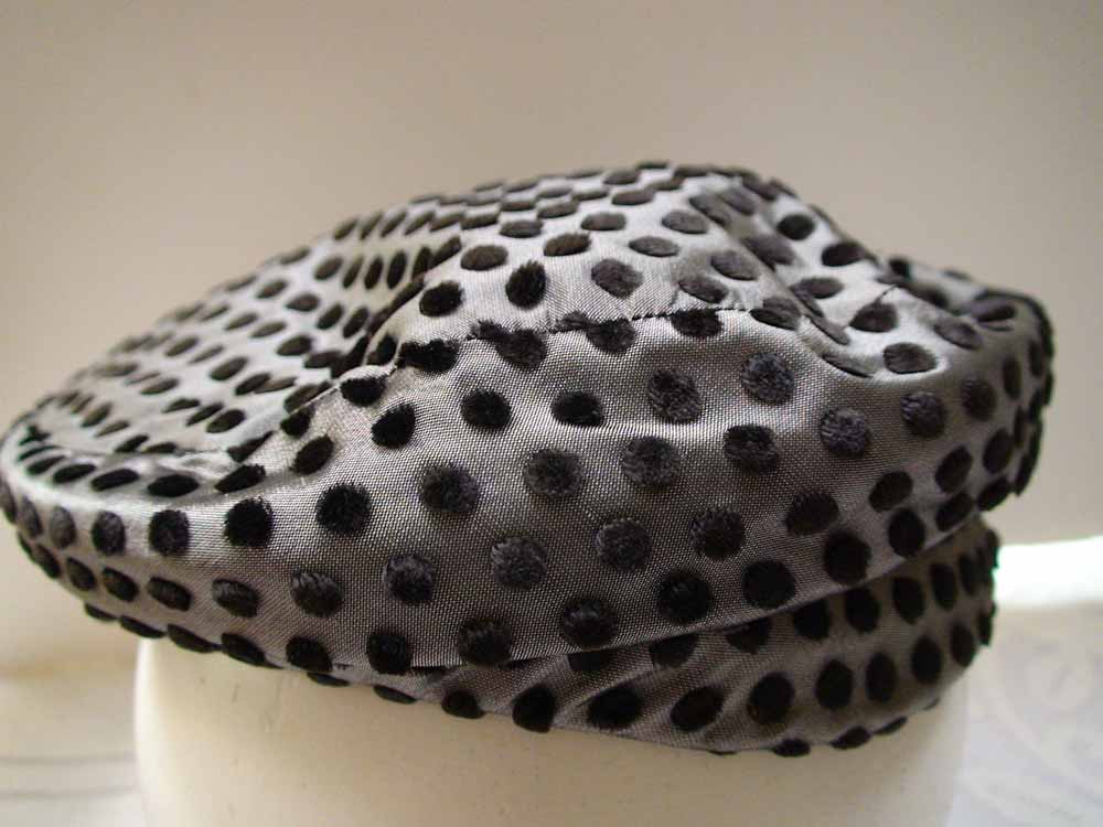 Soft beret made of silver taffeta with flocked black polka dots