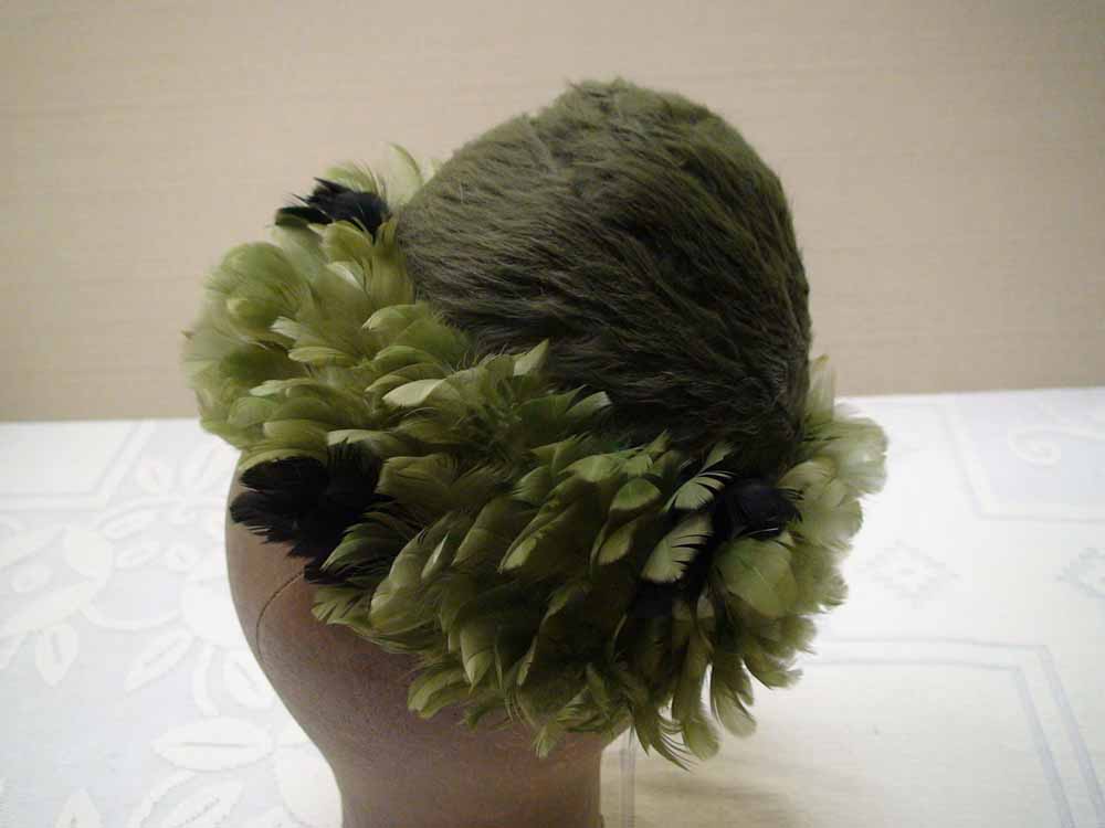 Green fuzzy fur felt rounded cone hat with band of frothy feathers
