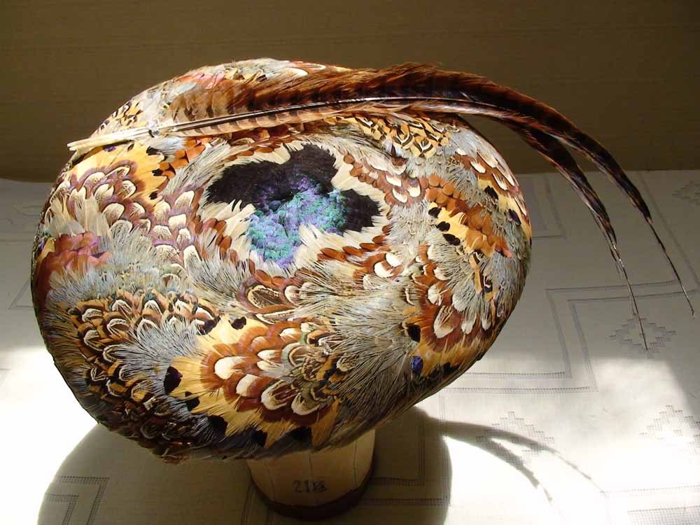 Multi-colored pheasant modified mushroom/dish with two pheasant tail feathers