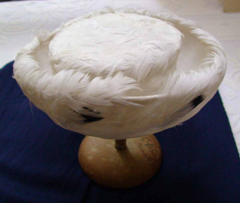 White and black all-over feather Breton with flat crown. All over white hackle feathers sprinkled with a few black feathers cover the hat body.