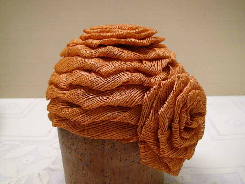 Pumpkin colored straw is braided into tubes and wrapped into a spiral that looks like a rose itself, and then is formed into a rose at the left front.