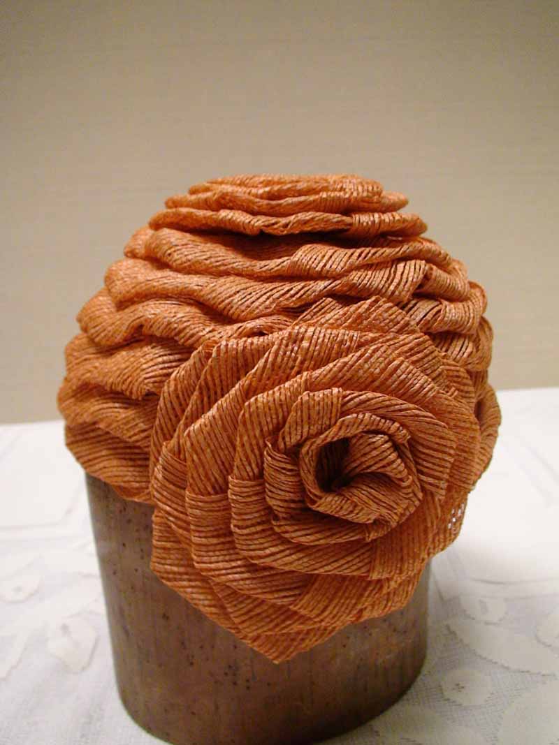 Pumpkin colored straw is braided into tubes and wrapped into a spiral that looks like a rose itself, and then is formed into a rose at the left front.
