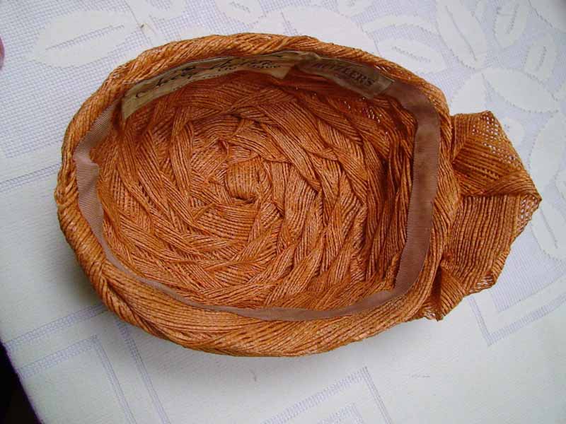 Pumpkin colored straw is braided into tubes and wrapped into a spiral that looks like a rose itself, and then is formed into a rose at the left front.