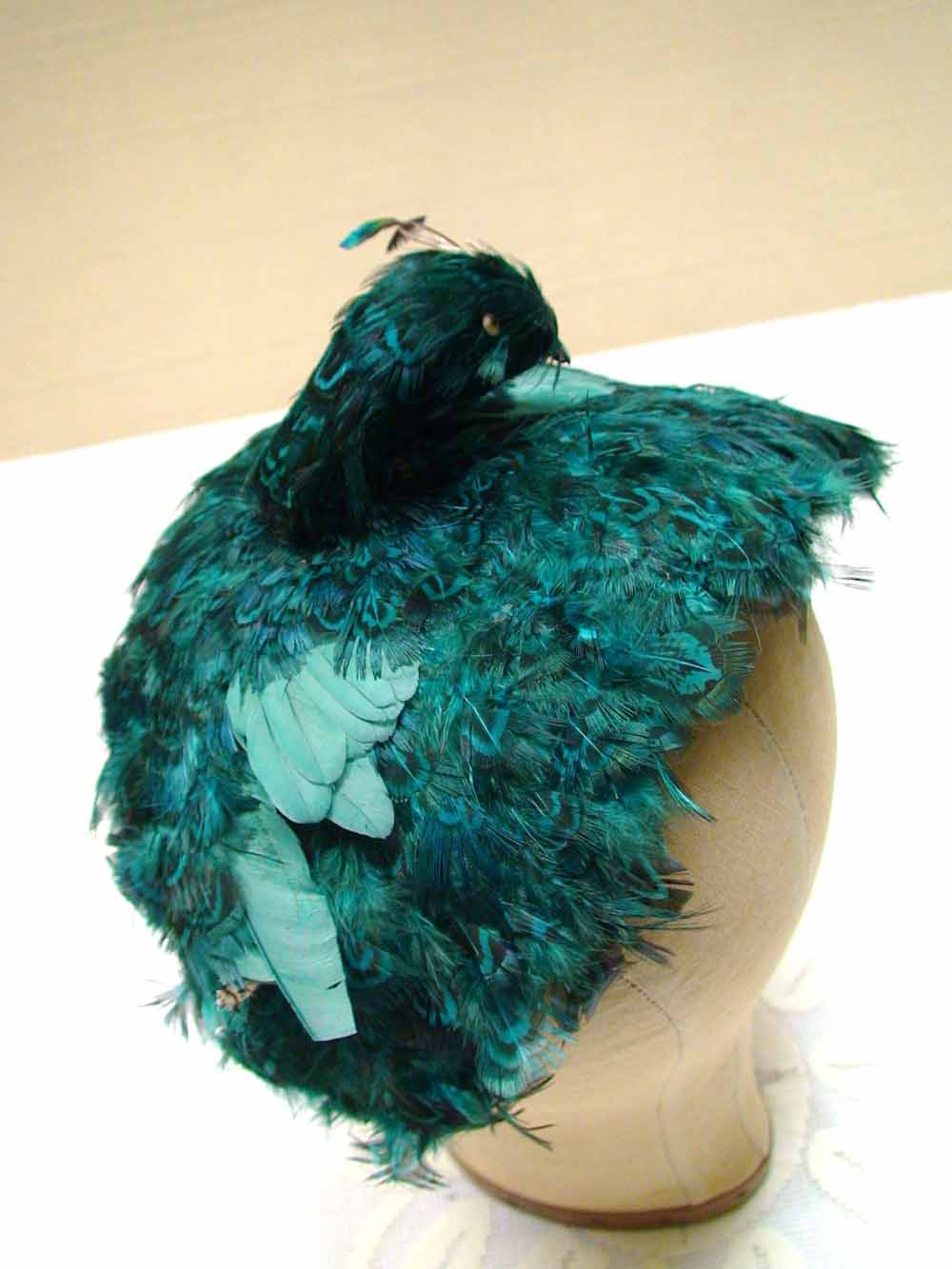 Aqua all-over feather bandeau bird hat with peacock topknot feathers