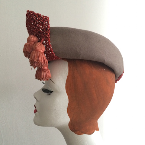 Sculpted grey felt Breton, with pork pie crown and high red and gold cord macramé wing with tassels