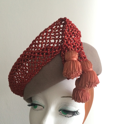 Sculpted grey felt Breton, with pork pie crown and high red and gold cord macramé wing with tassels