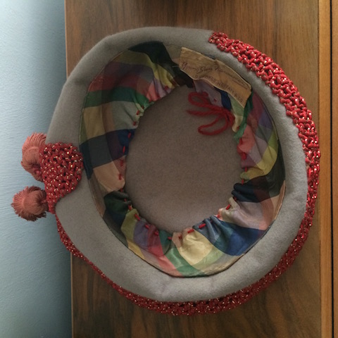 Sculpted grey felt Breton, with pork pie crown and high red and gold cord macramé wing with tassels