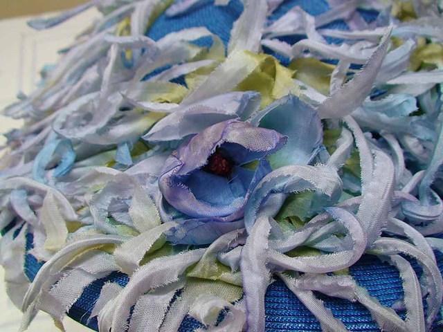 Cornflower blue fine straw platter with silk flowers and chrysanthemum-like silk petals covering the top.